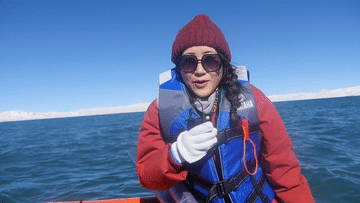 說不害怕那是假的,我時(shí)刻準(zhǔn)備著被大浪拍進(jìn)湖里去。心里想著,反正有救生衣,就算真掉湖里了,也不至于淹死吧,頂多冷點(diǎn)兒!后來,我把這個(gè)想法告訴同行的專家時(shí),他們搖著頭說,真掉下去可不得了。這個(gè)氣溫可是會(huì)凍死人的。