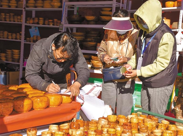 山南本地的特色優(yōu)質商品尤其受到青睞:扎囊的氆氌,洛扎的粉絲,瓊結的蕎麥面,加查的核桃、木碗,貢嘎的邦典、紅土豆,措美的奶渣、牛羊肉等等,紛紛占據(jù)重要展位,引來消費者紛至沓來,熱情選購。