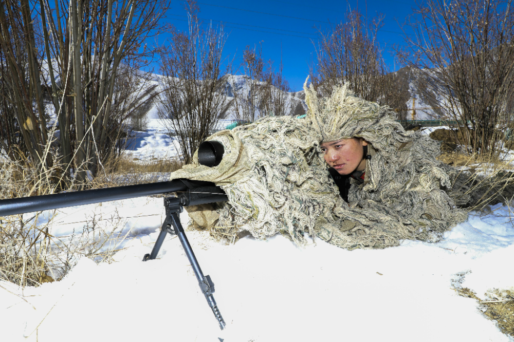 達娃卓嘎在雪地中潛伏狙擊。楊勇 攝