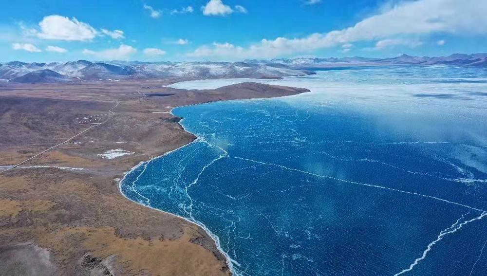 位于西藏山南市洛扎縣和浪卡子縣交界處的普莫雍錯(cuò),是喜馬拉雅山脈間的一個(gè)咸水湖,湖面海拔5070m。冬季的普莫雍錯(cuò)湖面會(huì)結(jié)冰,冰面通透可見湖底,在陽光的照射下,呈現(xiàn)出動(dòng)人心魄的藍(lán)。