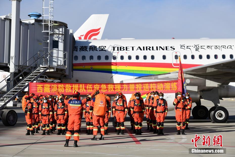 1月20日,西藏自治區(qū)消防總隊在拉薩貢嘎國際機場開展2022年跨區(qū)域地震災害應急救援力量投送拉動演練。據(jù)悉,演練投送的裝備主要為個人72小時保障物資、通信器材和輕便型的相關(guān)救援器材。 中新社記者 貢嘎來松 攝