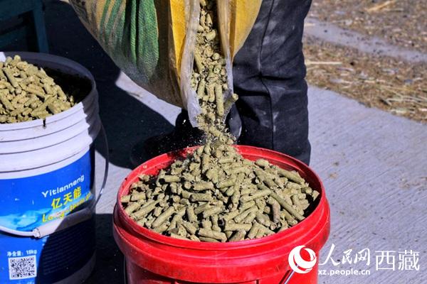 在合作社有一間飼草加工車間。嘎瑪?shù)┻_(dá)介紹:“下一步我們要結(jié)合鄉(xiāng)村振興,增加飼草的附加值,將青干草充分利用起來(lái),生產(chǎn)顆粒飼料。目前,車間在試運(yùn)行階段。已經(jīng)加工了160噸。這些飼料中混合了玉米、大豆等,既提高了青干草的利用率和營(yíng)養(yǎng)價(jià)值,也降低了運(yùn)輸成本,很受市場(chǎng)歡迎。我們還想做綠色商標(biāo),打品牌知名度?!?/p>