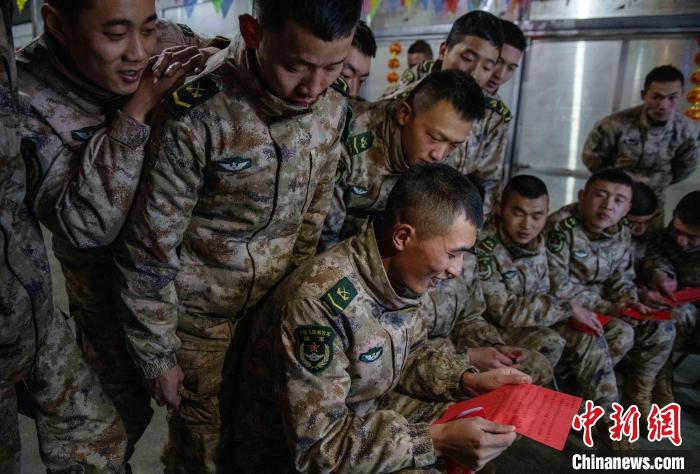 聯(lián)歡的尾聲指導(dǎo)員夏邦國拿著最后的彩袋走到臺前,把晚會推向高潮,“兄弟們,這還有一大袋紅包,里面裝著的可是最珍貴的祝?!薄9俦鴤冇贸槊ず械男问讲痖_新年的“紅包”。中士趙路寬抽到一個(gè)最鼓的,打開是滿滿的糖果;下士吳兵拆開的是一個(gè)帶有小機(jī)關(guān)的新年賀卡;下士鄧云川拆到一封遠(yuǎn)方的匿名信,“雖不曾相見與相識,但知道是你們在默默堅(jiān)守付出,守衛(wèi)著祖國的雪域邊防”。伴隨著他磕絆的普通話,連隊(duì)官兵漸漸安靜下來。“邊關(guān)有我,請祖國和人民放心”,簡易投影的大屏上開始播放著官兵們一年多來頂風(fēng)冒雪,戰(zhàn)天斗地的光影片段,在這大山里的多少的苦累酸甜,都已經(jīng)鐫刻在茫茫雪域。