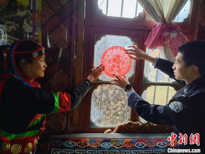 圖為林芝達(dá)木邊境派出所民警為轄區(qū)民眾貼窗花。 王濤 攝