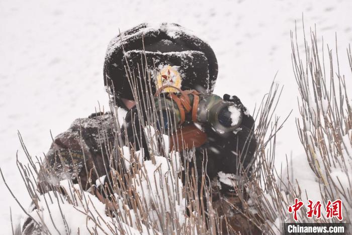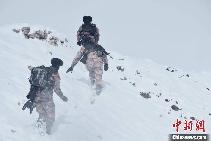 由于道路積雪較厚,車輛無(wú)法通行。官兵們采取徒步方式向點(diǎn)位前行,巡邏分隊(duì)在風(fēng)雪中艱難前行,隨著海拔的逐漸增加,氧氣愈發(fā)稀薄,此時(shí)的氣溫已經(jīng)接近零下30攝氏度。