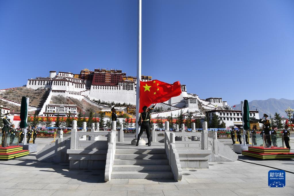 上午10時,隨著《義勇軍進(jìn)行曲》的響起,五星紅旗在布達(dá)拉宮廣場迎風(fēng)飄揚。大家肅穆而立,向著國旗行注目禮。