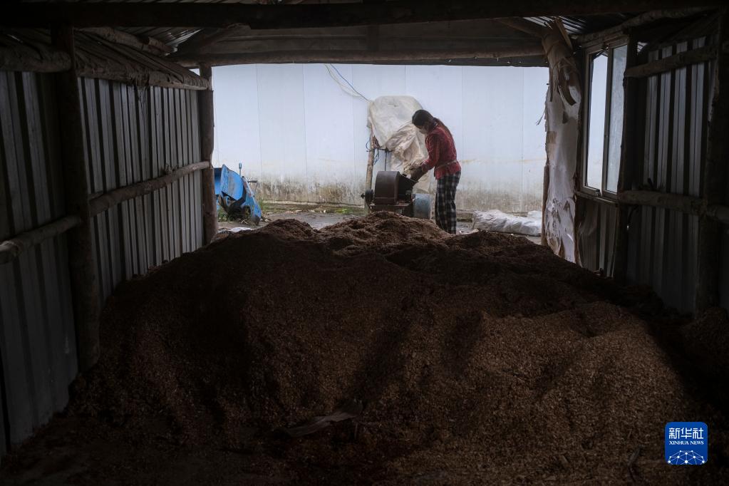 4月14日,明珠措姆在磨碎玉米芯,準(zhǔn)備制作菌棒。新華社記者 孫非 攝