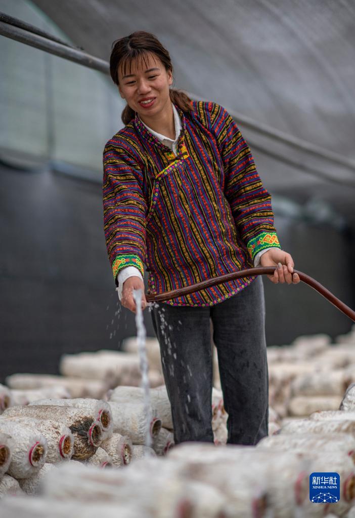 4月14日,次仁拉珍在給菌棒澆水。新華社記者 格桑邊覺(jué) 攝