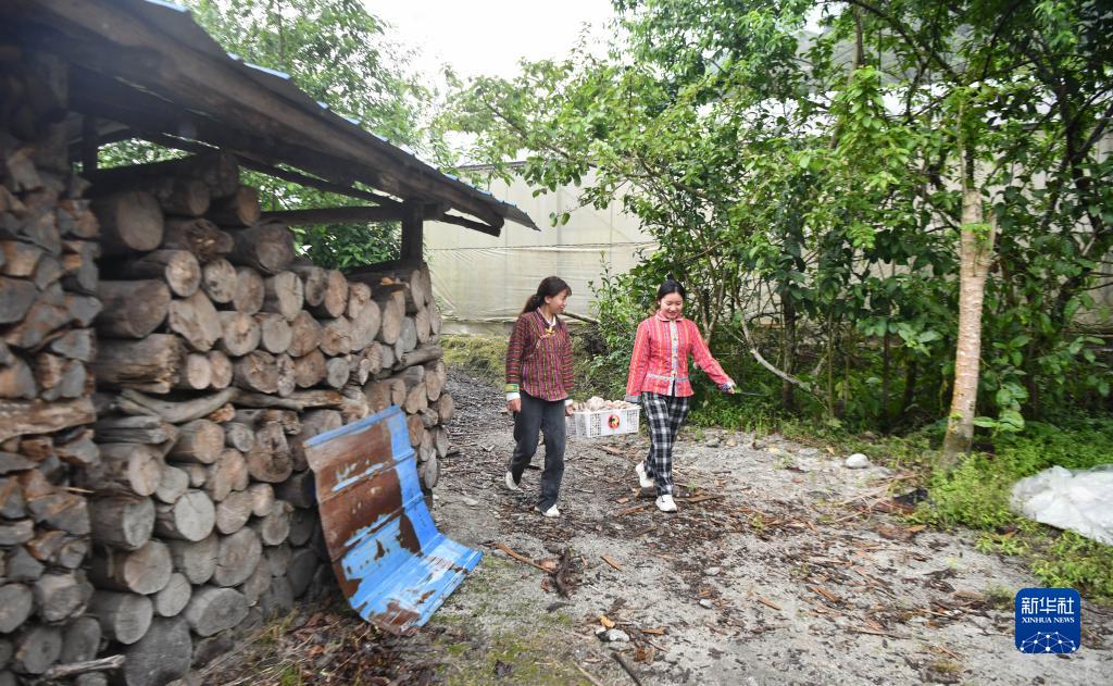 4月14日,姐姐次仁拉珍(右)和妹妹明珠措姆在采摘平菇。新華社記者 孫非 攝