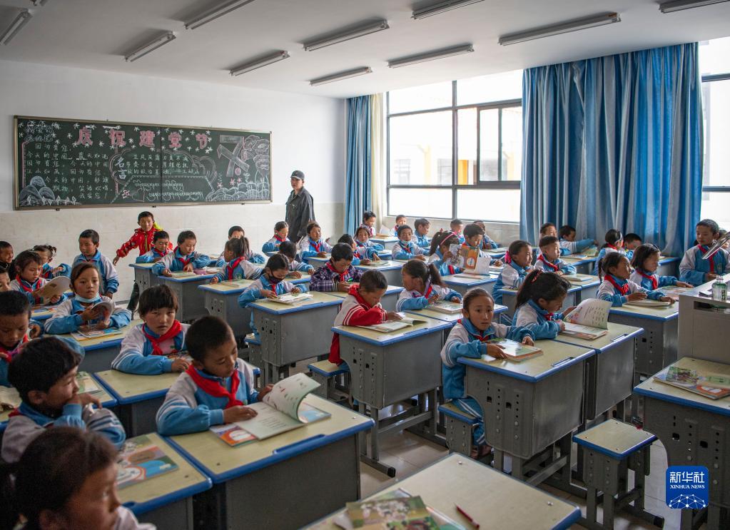 在森布日幸福家園九年一貫制學(xué)校的教室里,學(xué)生們?cè)谏献粤?xí)(資料圖)。新華社記者孫非攝
