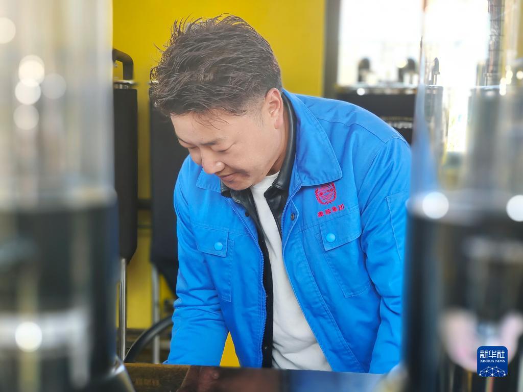 4月11日,拉瓊在青稞體驗(yàn)館配酒。新華社記者 劉洲鵬 攝