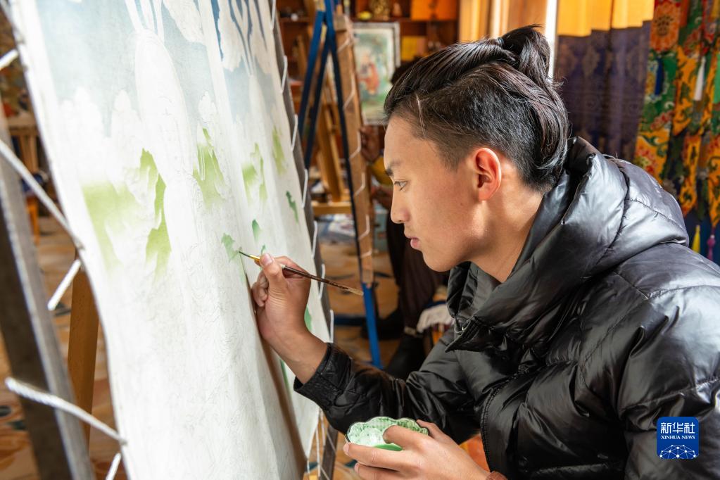在昌都市察雅縣的產業(yè)車間,唐卡畫師在作畫(4月8日攝)。新華社記者 周荻瀟 攝