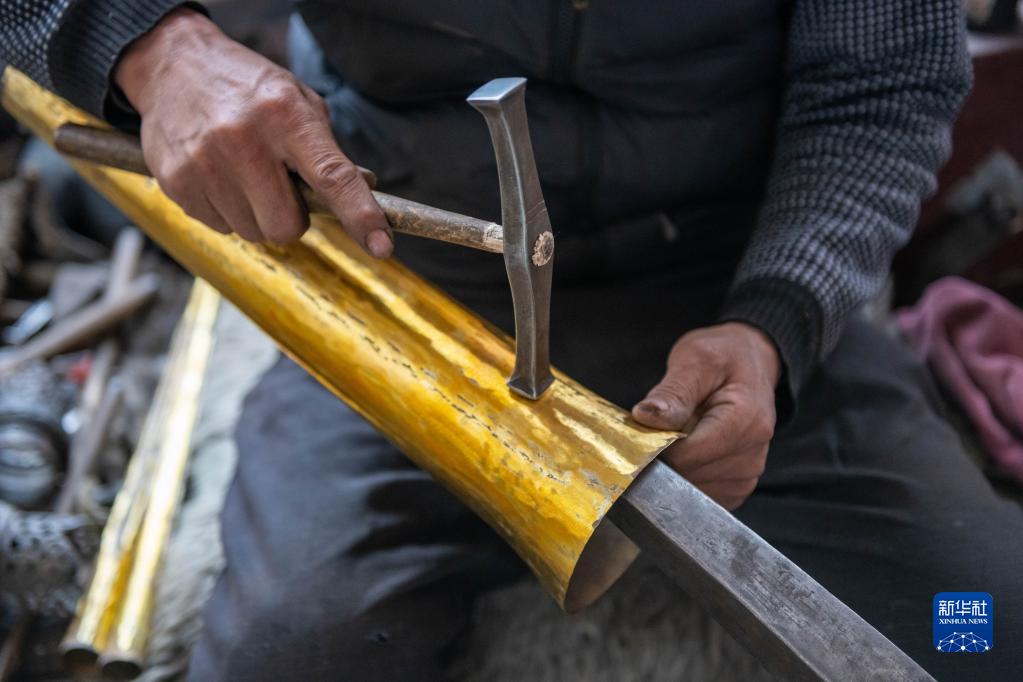 在昌都市察雅縣的產業(yè)車間,手工藝人吹響已加工好的樂器(4月8日攝)。新華社記者 周荻瀟 攝
