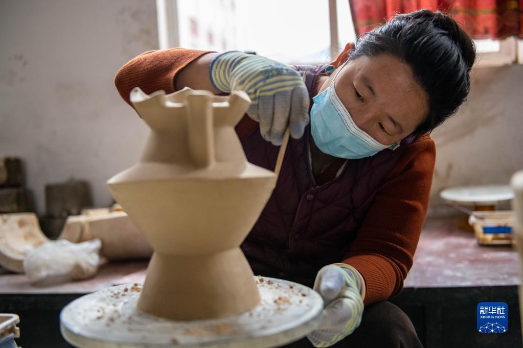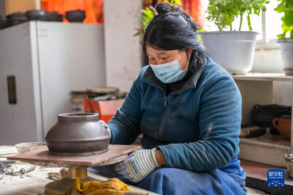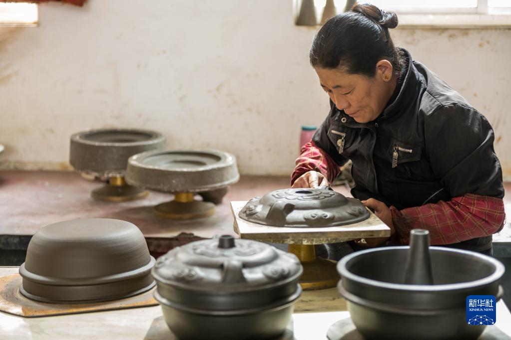 在昌都市察雅縣的產業(yè)車間,手工藝人在加工器皿(4月8日攝)。新華社記者 格桑朗杰 攝