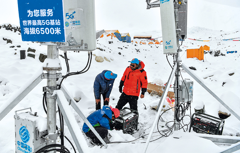 在海拔 6500 米的珠峰前進(jìn)營地,中國移動工作人員在調(diào)試 5G 基站(2020 年 5 月 21 日攝) 晉美多吉 攝