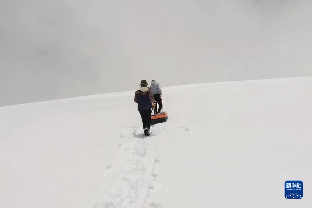 科考人員拉著冰川雷達(dá)測(cè)厚儀開(kāi)展測(cè)量工作。(受訪者供圖)