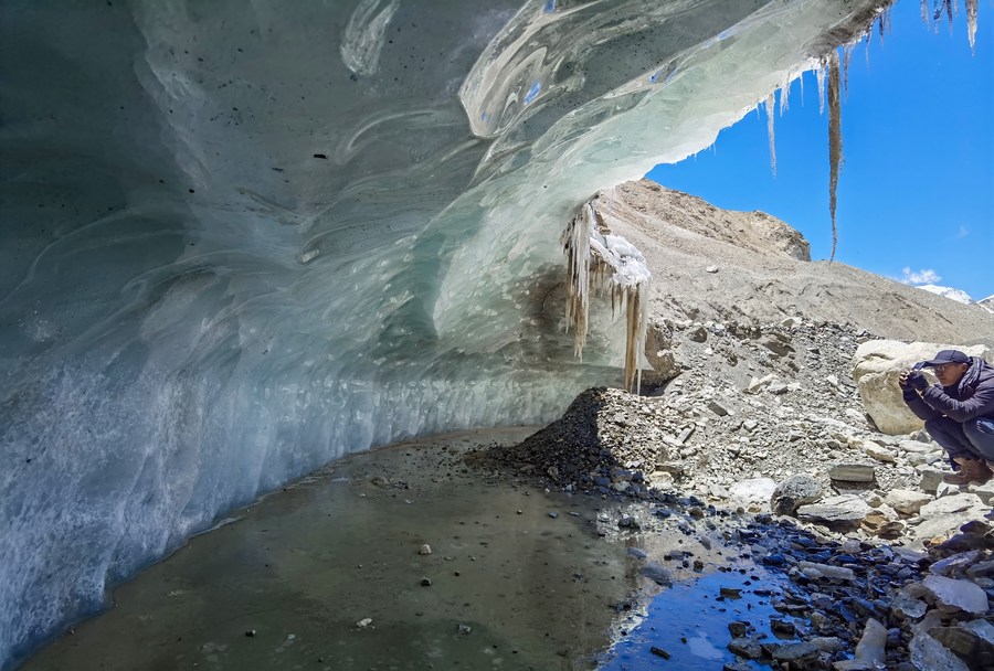 冰川與污染物小組在東絨布冰川觀察測量(5月6日攝,手機照片)。新華社發(fā)(受訪者供圖)