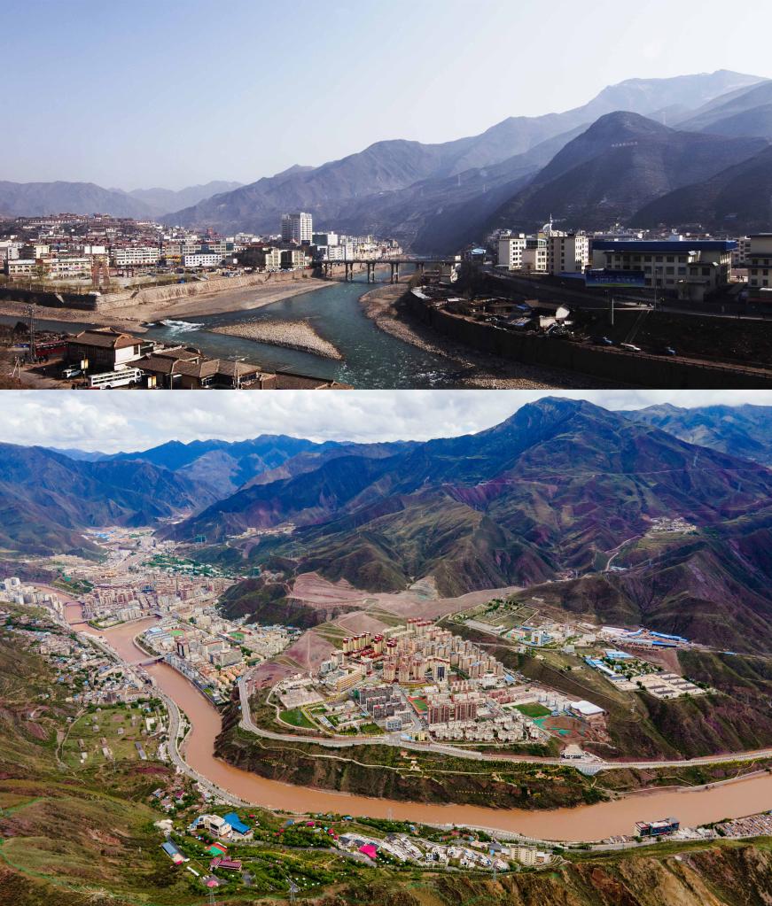 拼版照片:上圖是2009年3月15日拍攝的昌都(新華社記者 普布扎西 攝);下圖是2022年5月22日拍攝的昌都市卡若區(qū)(新華社記者 周荻瀟 攝,無人機(jī)照片)。新華社發(fā)