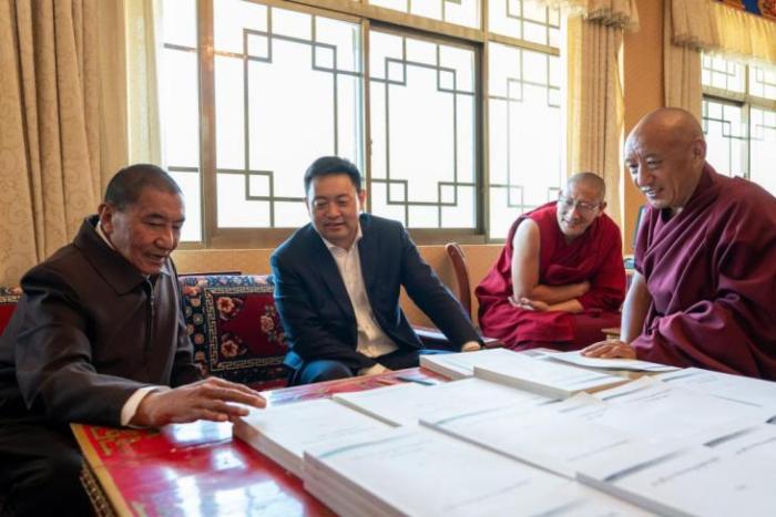 2022年4月15日,西藏自治區(qū)黨委常委、統(tǒng)戰(zhàn)部部長(zhǎng),自治區(qū)政協(xié)黨組副書(shū)記、副主席嘎瑪澤登(左二)在西藏佛學(xué)院調(diào)研。 本報(bào)記者 江飛波 攝
