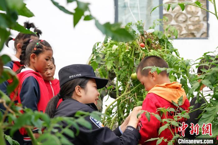 圖為亞東出入境邊防檢查站民警楊琳帶著龐達(dá)村雙語幼兒園小朋友認(rèn)識(shí)成熟了的西紅柿。李錦輝 攝