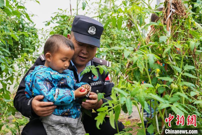 圖為亞東出入境邊防檢查站民警與龐達(dá)村雙語幼兒園小朋友共同采摘成熟了的西紅柿。李錦輝 攝