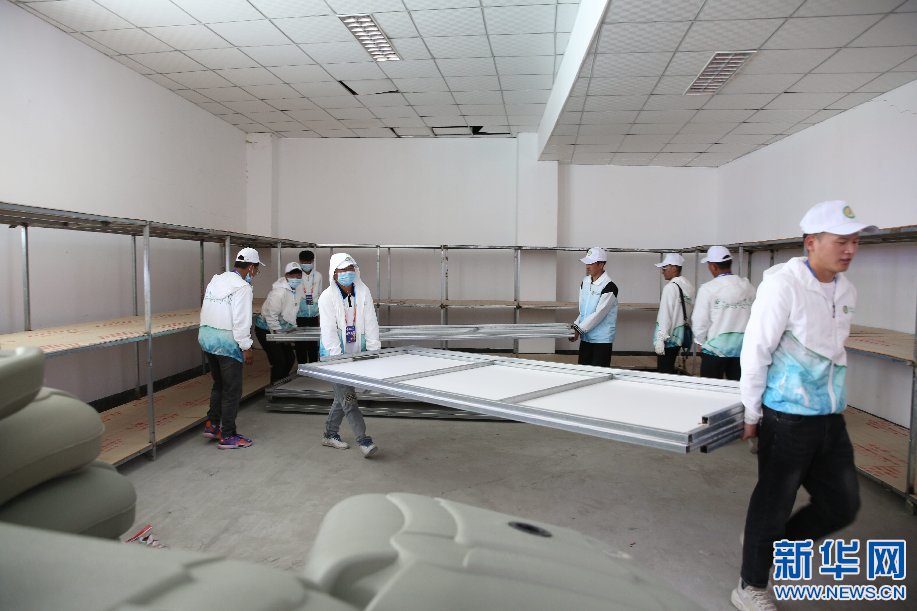 志愿者正在布置運(yùn)動會場地。(劉勇 攝)