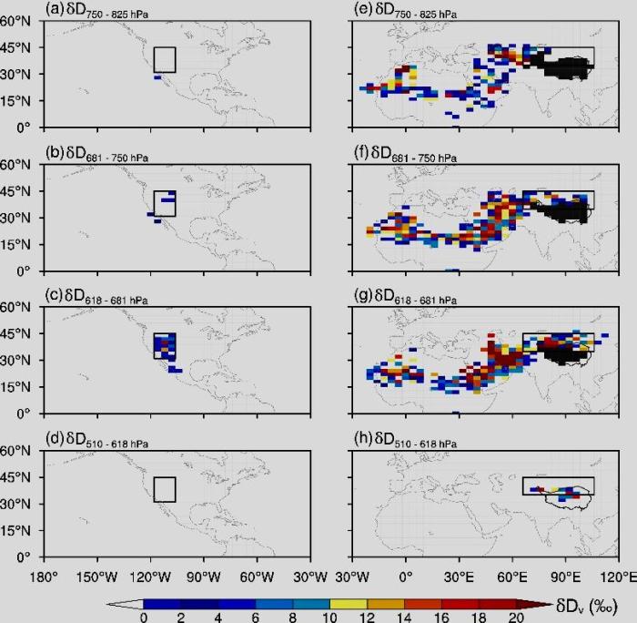 夏季美國西部和亞洲干旱區(qū)不同層水汽穩(wěn)定同位素的“反高程效應(yīng)”的空間分布格局。 中科院青藏高原所 供圖