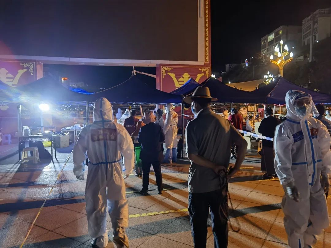 “為了您的安全,請(qǐng)保持1米以上間隔,謝謝?!蓖砩?點(diǎn)多,在茶馬廣場(chǎng),支隊(duì)三級(jí)消防士張興梁,依然堅(jiān)守在抗疫一線,維持著排隊(duì)做核酸的長(zhǎng)隊(duì)。從早上7點(diǎn)開(kāi)始,張興梁和其他消防隊(duì)員已堅(jiān)守了14個(gè)多小時(shí)?!拔鞑貢円箿夭钐卮?,白天防護(hù)服里面衣服都濕透了,但是到晚上這個(gè)點(diǎn)已經(jīng)干了,正好不用換衣服了?!睆埮d梁打趣的說(shuō)到。