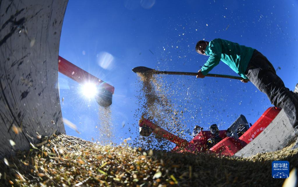 西藏日喀則市江孜縣熱索鄉(xiāng)努康村農(nóng)機合作社的村民在整理收割機收獲的小麥(2022年9月19日攝)。新華社記者 晉美多吉 攝