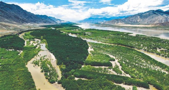 持續(xù)開展國土綠化行動,大美西藏生態(tài)持續(xù)良好。截至2021年底,全區(qū)森林覆蓋率達(dá)12.31%,草原綜合植被覆蓋度達(dá)47.53%,全區(qū)環(huán)境空氣質(zhì)量優(yōu)良率達(dá)99.8%,地表水質(zhì)達(dá)標(biāo)率100%。圖為雅魯藏布江山南段沿線通過植樹造林形成的長160公里、平均寬約1.8公里的綠色長廊。
