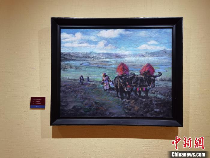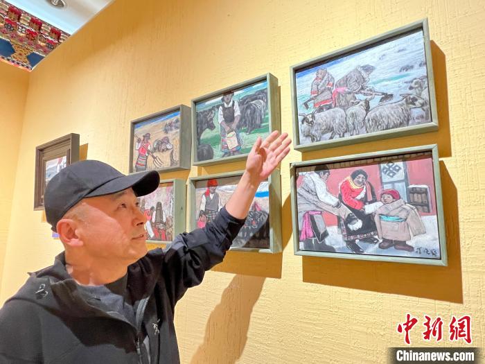 策展人李亞男向中新網(wǎng)記者介紹,崔曉曉首次到西藏那曲便結(jié)識(shí)了一位當(dāng)?shù)嘏笥选?,他將這位藏族青年放牧、添置汽車、蓋新房等畫面用畫筆記錄了下來,在本次展覽中展出。