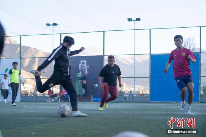 圖為12月12日,拉薩市城關(guān)區(qū)仙足島室外足球場里,市民正在踢球。中新社記者 貢嘎來松 攝