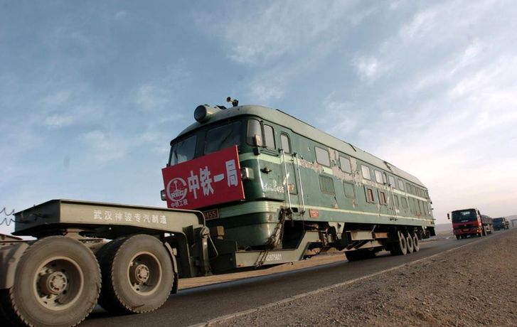 2005年4月19日,一輛汽車上裝著一輛機車,從青海省格爾木市秀水河車站經(jīng)過青藏公路向西藏安多方向行駛。青藏鐵路建設總指揮部從2004年3月開始陸續(xù)把近200臺機車、鋪軌機、架橋機、軌道車等大型鋪架設備用汽車從格爾木安全運抵西藏安多,途中翻越海拔5231米的唐古拉山埡口,創(chuàng)造了鐵路建設史上的奇跡。
