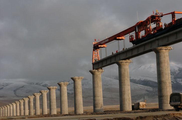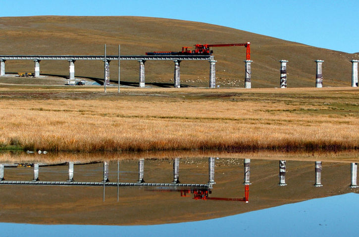 2004年10月1日,工人們正在架設青藏鐵路那曲以橋代路特大橋。