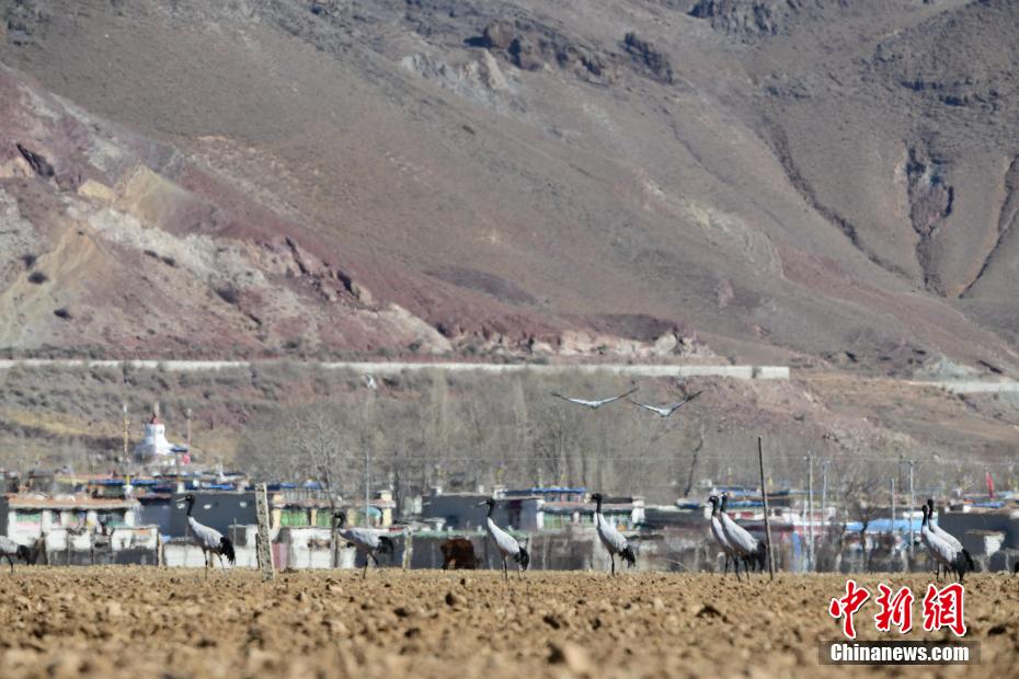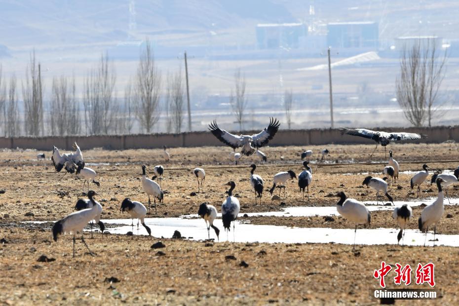 每年的10月底,成群的黑頸鶴飛到西藏拉薩市林周縣越冬,在拉薩市林周縣周邊的湖泊濕地度過5個月的“閑云野鶴”生活,次年三四月份再飛向藏北草原繁殖。黑頸鶴是世界上唯一一種高原鶴類。具有足長、喙長、頸長的典型涉禽類特征,適合在沼澤地里行走。黑頸鶴的頸、尾為黑色,體羽為灰白色。黑頸鶴是國家一級保護(hù)動物。目前,每年到林周縣越冬的黑頸鶴已達(dá)2000只左右。圖為黑頸鶴在林周境內(nèi)的農(nóng)田里覓食、嬉戲。 貢嘎來松 攝
