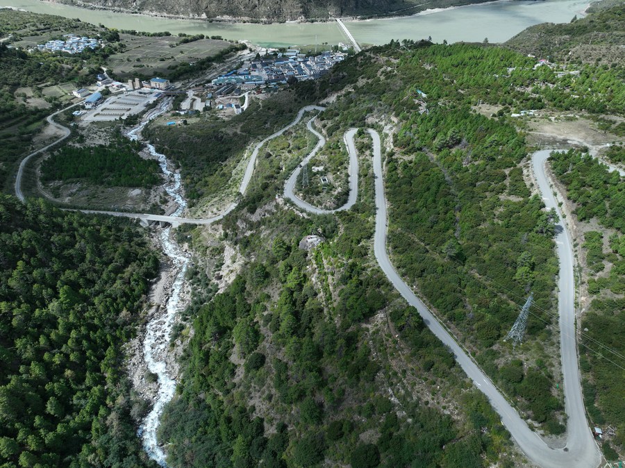 這是2022年9月30日拍攝的派墨公路派鎮(zhèn)起點(diǎn)路段(無人機(jī)照片)。新華社發(fā)(董志雄 攝)