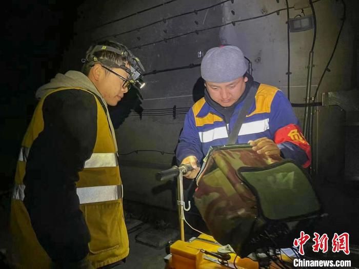 次旦平措(右)與同事深夜在拉林鐵路進(jìn)行鋼軌探傷作業(yè)。 馬生明 攝