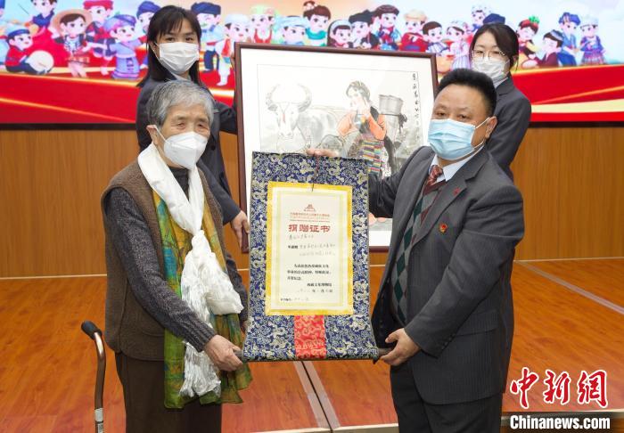 圖為活動(dòng)當(dāng)天知名畫(huà)家吳茜向中國(guó)藏學(xué)研究中心西藏文化博物館捐贈(zèng)西藏主題作品。中國(guó)藏學(xué)研究中心供圖