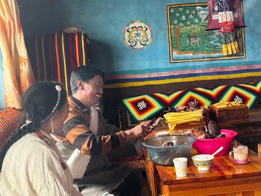 增措的丈夫娃布正在切肉(2023年3月8日攝)。新華社記者 格桑邊覺 攝