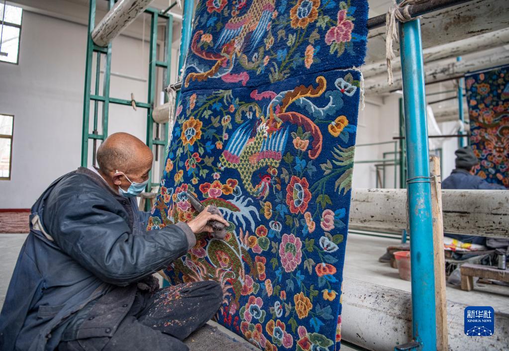 在江孜縣地毯廠,工人對(duì)卡墊進(jìn)行修剪(3月19日攝)。新華社記者 孫非 攝