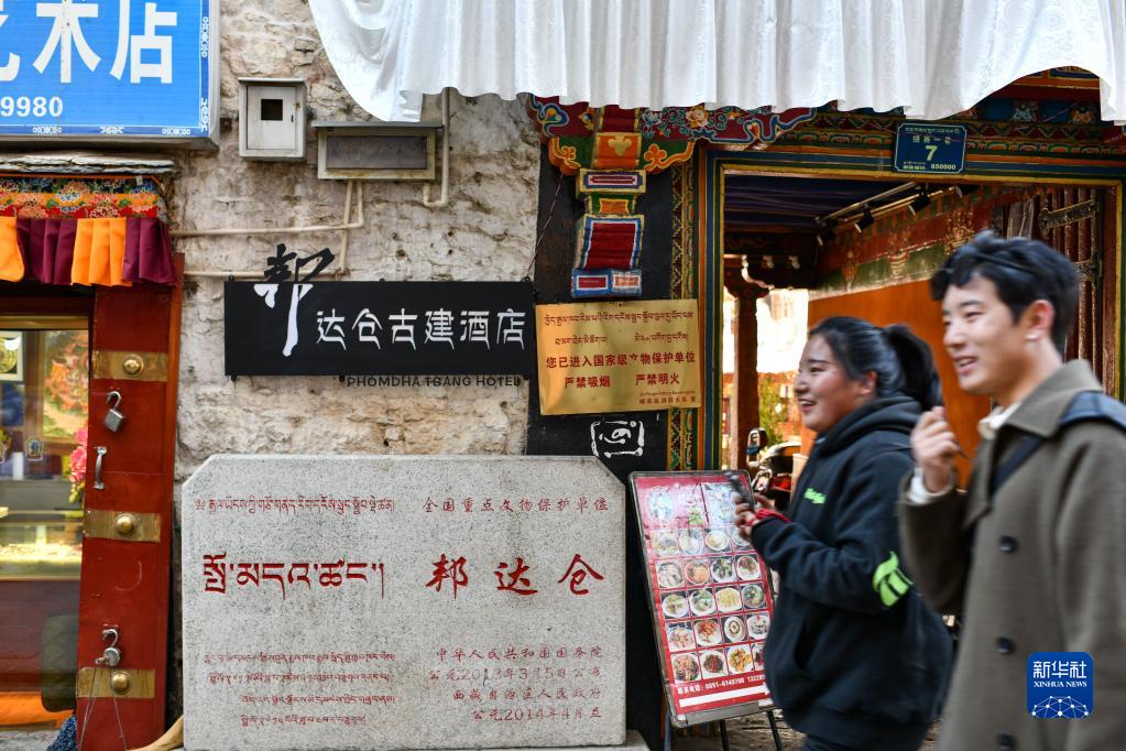 西藏拉薩市民走過八廓街老城區(qū)邦達(dá)倉(cāng)古建酒店(2023年3月24日攝)。新華社記者 晉美多吉 攝
