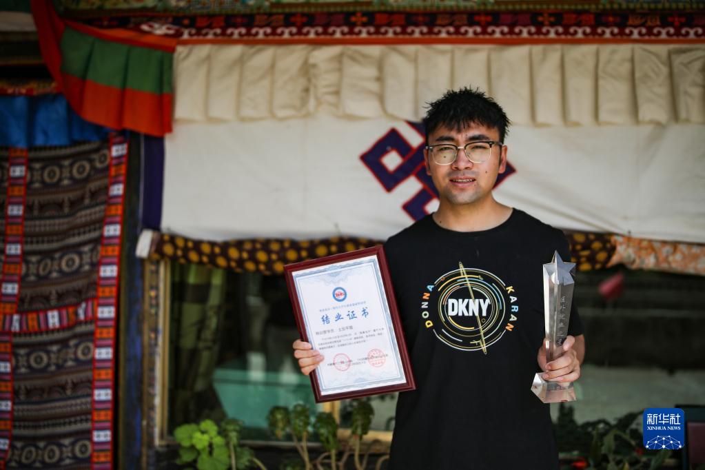 “格?;ㄩ_”大學(xué)生就業(yè)創(chuàng)業(yè)特訓(xùn)營(yíng)學(xué)員、江蘇今世緣酒業(yè)股份有限公司甘青藏大區(qū)業(yè)務(wù)經(jīng)理土旦平措展示特訓(xùn)營(yíng)結(jié)業(yè)證書和“區(qū)外就業(yè)之星”獎(jiǎng)杯(2022年6月23日攝)。新華社記者 姜帆 攝