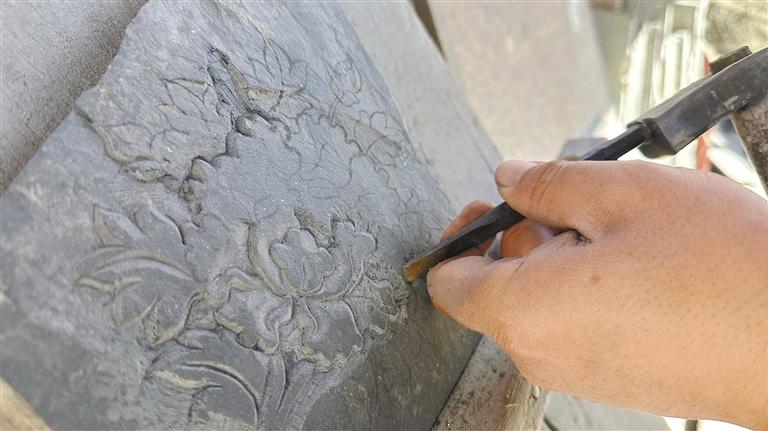 在拉薩市城關區(qū)金珠西路街道當巴路上有好幾家傳統(tǒng)石刻技藝的工作坊,房前屋后堆滿了各式各樣的石頭及雕刻成品。一塊石板置在木架上,桑周才仁席地而坐,手執(zhí)一把細長的刻刀,聚精會神地用鐵錘有節(jié)奏地敲擊著刻刀尾部,在石板上雕刻吉祥八寶中的蓮花。布滿厚繭的雙手像堅實渾厚的巖石,這是桑周才仁對這門技藝堅守的沉淀。“干我們這活就是特別臟特別累,一坐就是一整天。”面對記者的來訪,滿身灰塵和顏料的他顯得有點不好意思。