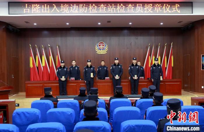 3月31日,邊檢站領(lǐng)導(dǎo)通過(guò)授章考核的移民管理警察授章?!⌒じ毁F 攝