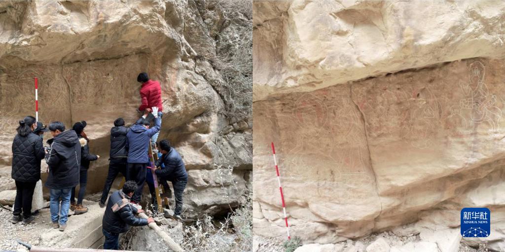 (左)工作人員正在對查果西溝B點(diǎn)摩崖石刻造像進(jìn)行調(diào)查記錄,(右)該摩崖石刻造像現(xiàn)狀。(資料圖片由西藏自治區(qū)文物保護(hù)研究所提供)
