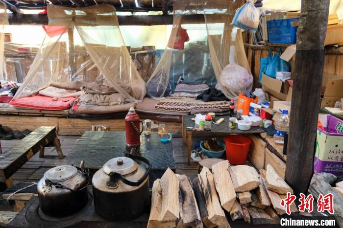 德瑪龍6號執(zhí)勤點木板房是大家在森林里的庇護所,進入后可以看到房內左右兩側布置了兩排通鋪,每人的床位由一個罩式蚊帳以及被褥組成,屋子中間有個藏式爐子,里面燒著并不干燥的木柴。