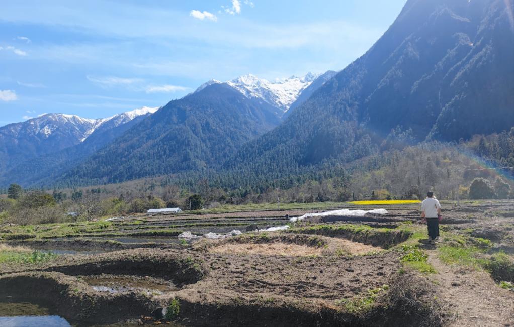西巴村一片片沃野鑲嵌在翠綠的山巒之間,油菜花、桃花點(diǎn)綴其間,映著遠(yuǎn)處的雪山,勾勒出一幅色彩斑斕的圖景。