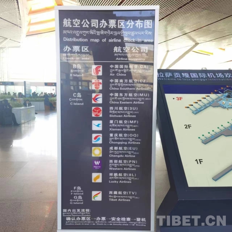 無托運(yùn)行李的旅客持個(gè)人身份證(或有效證件)前往自助值機(jī)區(qū)打印登機(jī)牌。有托運(yùn)行李和中轉(zhuǎn)聯(lián)程航班的旅客前往人工柜臺(tái)辦理。其中,乘坐西藏航空公司航班的旅客進(jìn)入出發(fā)大廳后左轉(zhuǎn)前往F、G島辦理乘機(jī)手續(xù),其他航空公司的旅客請(qǐng)前往B、C、D島辦理乘機(jī)手續(xù)。