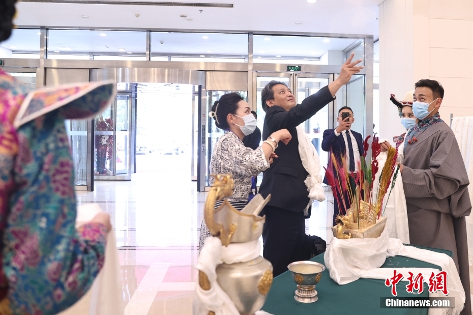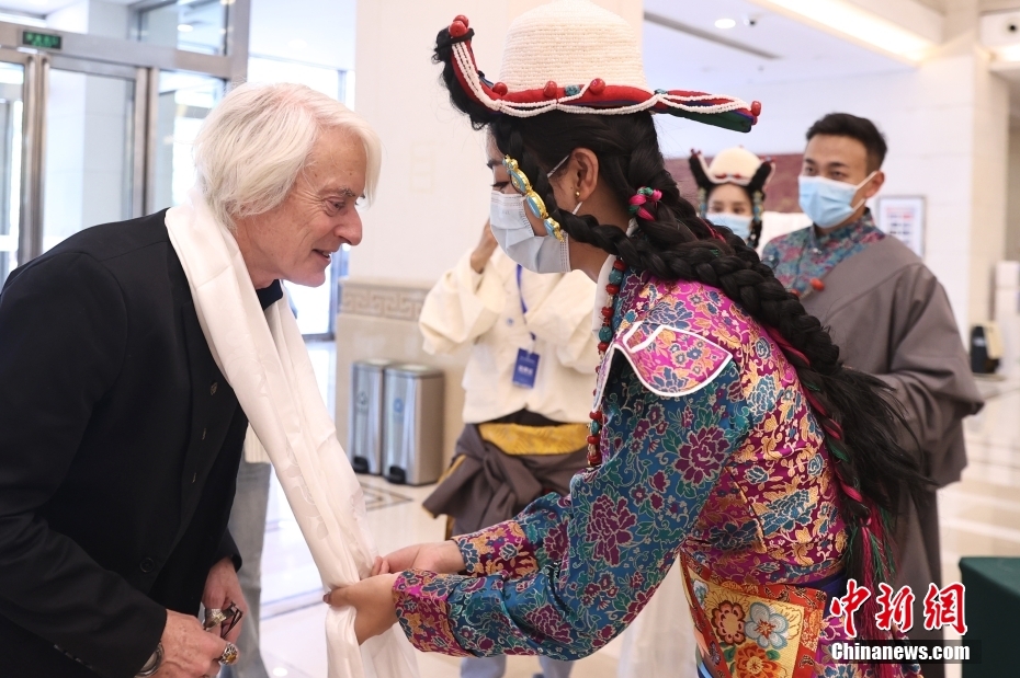 5月23日,“2023·中國西藏發(fā)展論壇”在北京舉行。會場外,活潑獨特的藏式迎賓舞蹈、展示西藏人文自然風(fēng)貌的圖片,已在論壇開幕前預(yù)熱起探討西藏新發(fā)展的氛圍。圖為著名紀(jì)錄片導(dǎo)演、全球化智庫(CCG)高級研究員龍安志(Lawrence Brahm)接受哈達(dá)。