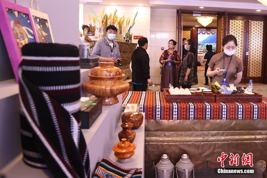 5月23日,“2023·中國西藏發(fā)展論壇”在北京舉行。會場外,活潑獨特的藏式迎賓舞蹈、展示西藏人文自然風(fēng)貌的圖片,已在論壇開幕前預(yù)熱起探討西藏新發(fā)展的氛圍。圖為展臺上,布置著色彩豐富的藏式布匹、紙藝文創(chuàng)產(chǎn)品、藏香、酥油茶等。